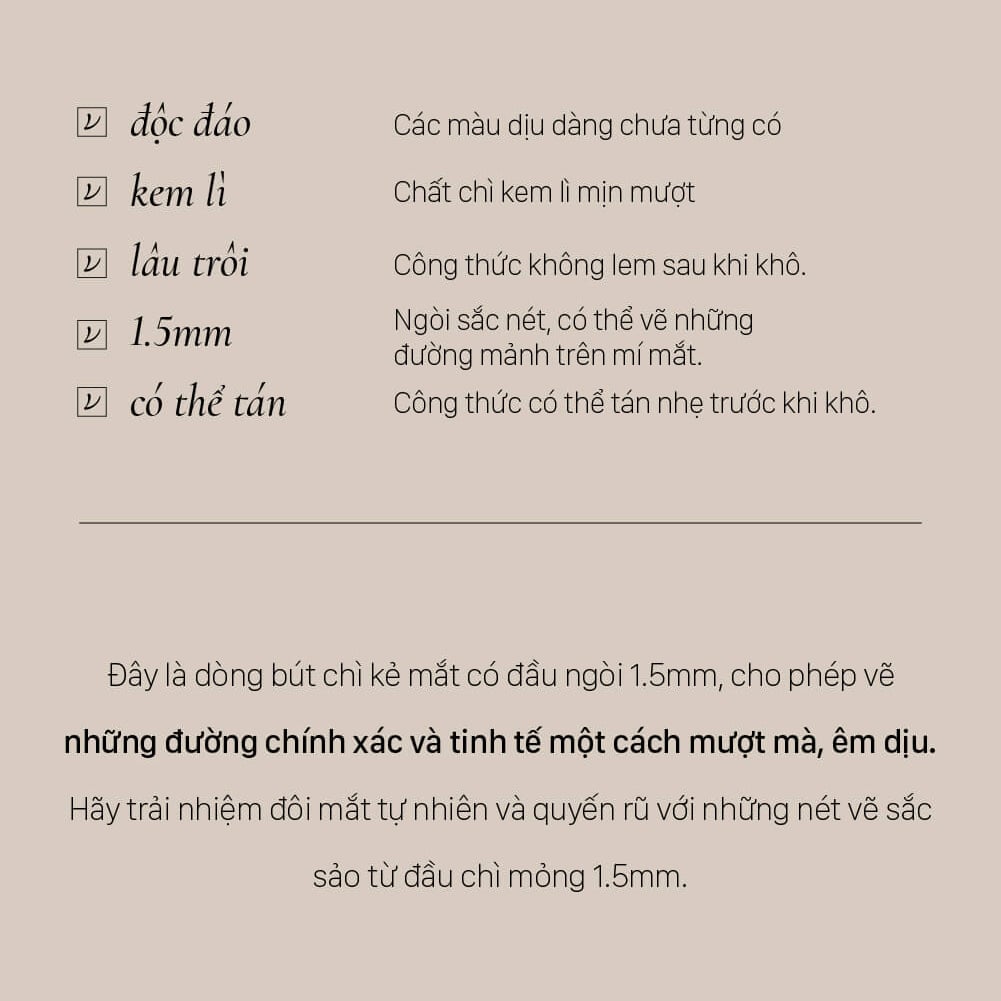 Với đầu chì chỉ từ 1.5mm kẻ một lần là đã có thể bám khít lên trên da, chỉ cần với thời gian ngắn màu chì đã có thể khô lại và không bị nhòe. Ở những giây đầu tiên (khi mực chưa khô) bạn có thể chỉnh sửa nét vẽ dễ dàng.