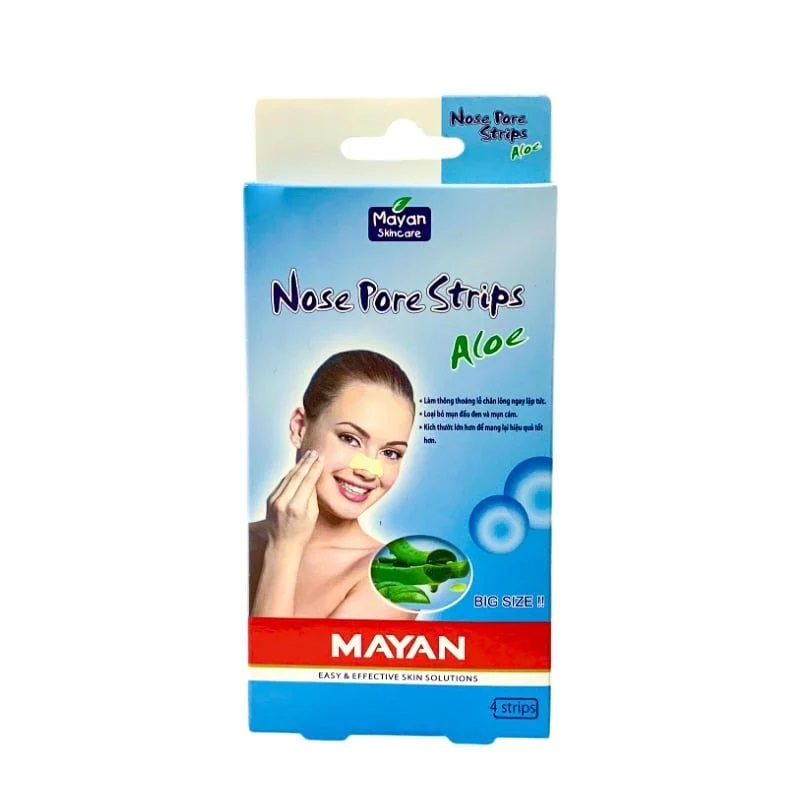 Mayan Nose Pose Strips Aloe là miếng lột mụn cám chứa lô hội của thương hiệu mỹ phẩm Hàn Quốc Mayan chứa các dưỡng chất thiên nhiên giúp lấy đi lớp bụi bẩn, bã nhờn, mụn cám, mụn đầu đen, giảm thiểu viêm nhiễm gây ra đối với vùng da mũi.