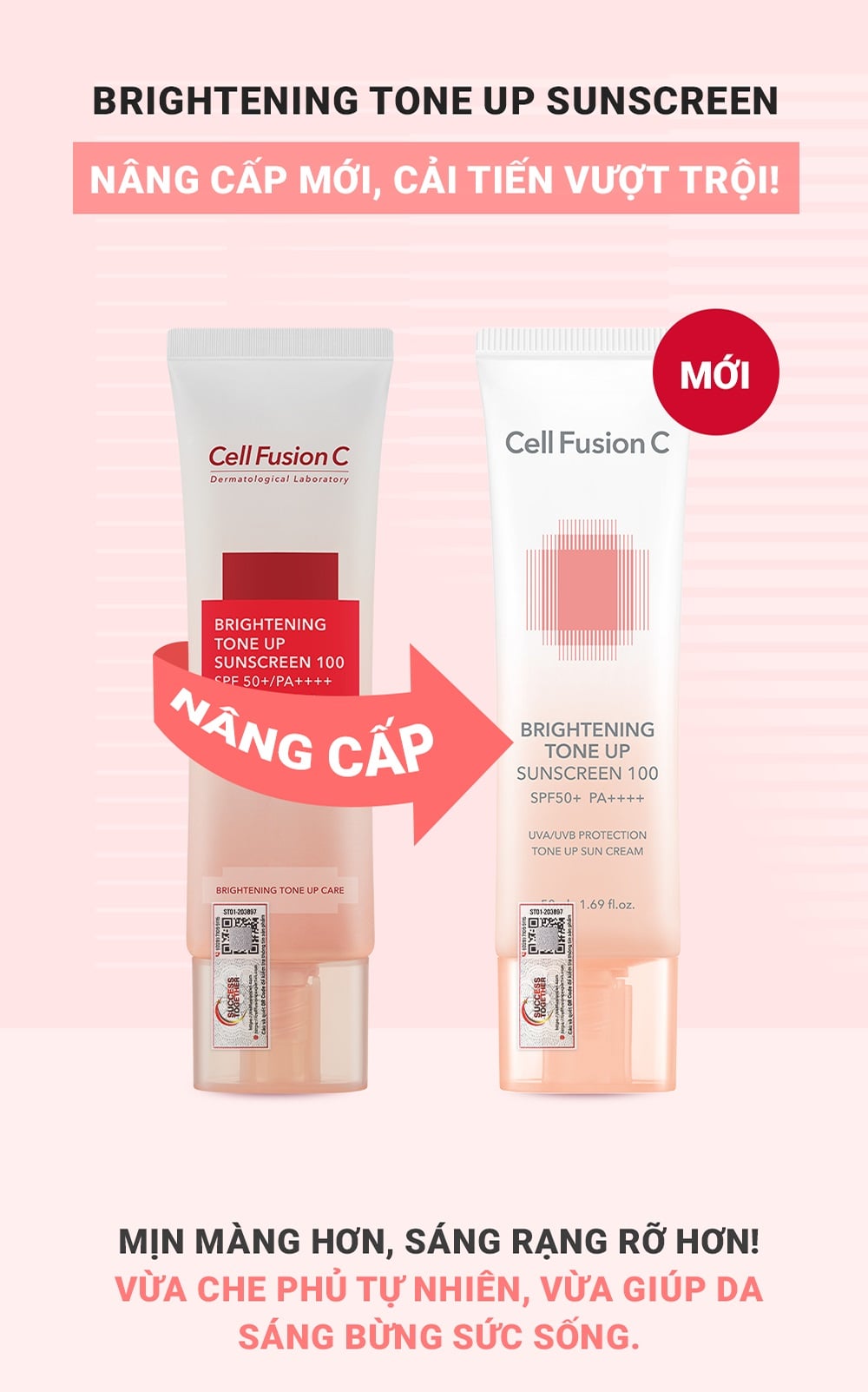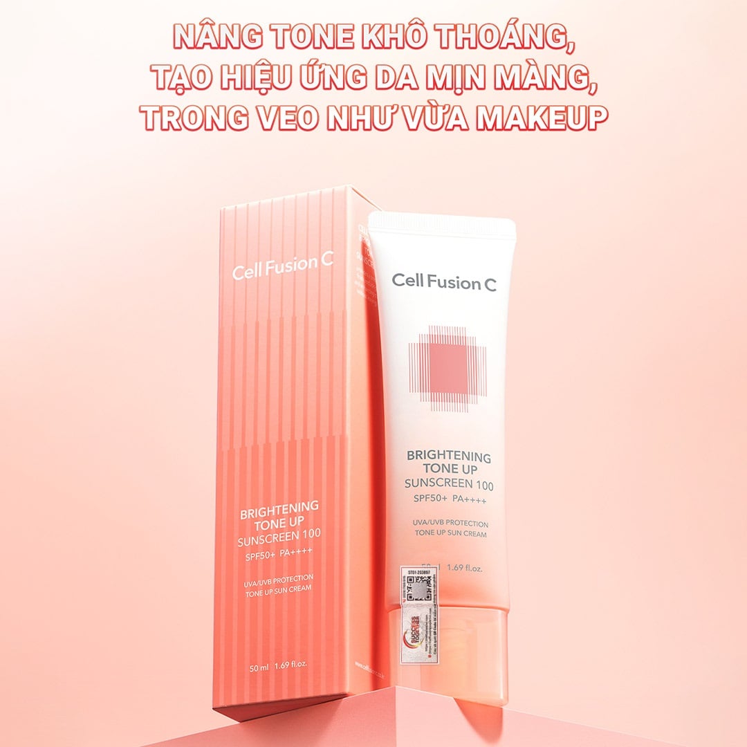 - Kem Chống Nắng Nâng Tông Cell Fusion C Brightening Tone Up Sunscreen SPF50+/PA++++ bảo vệ da khỏi tác hại của tia UV (tác nhân gây cháy nắng, sạm nám, không đều màu, lão hóa da), làm mịn, đều màu da, nâng tông da, hỗ trợ cải thiện độ đàn hồi và nếp nhăn. Có thể dùng như kem lót trang điểm.