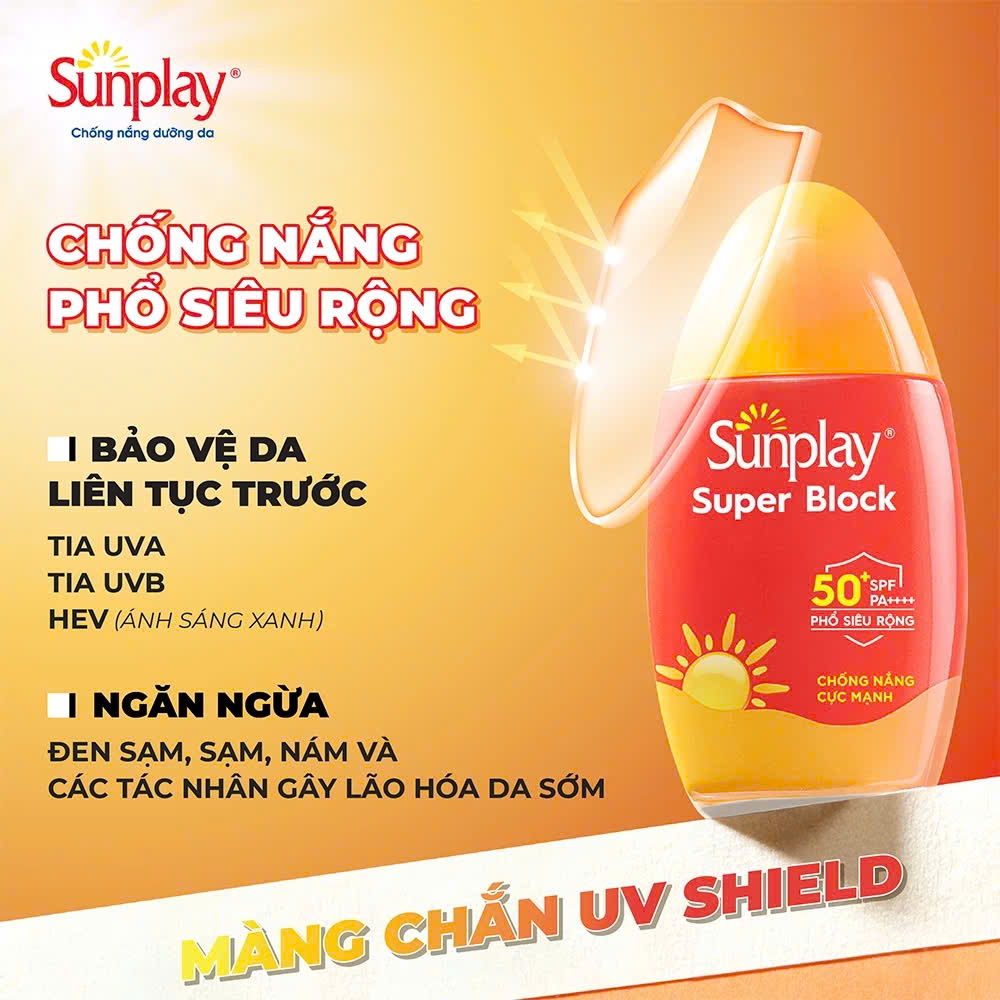 Sữa chống nắng Sunplay có kết cấu dạng sữa, thẩm thấu nhanh vào da, không gây bết dính, không làm bít tắc lỗ chân lông, không để lại vệt trắng trên da. Sản phẩm có khả năng kháng nước tốt, giúp giữ lớp chống nắng bền bỉ, lâu trôi, bảo vệ da hoàn hảo suốt cả ngày dài. Sunplay Super Block chứa các thành phần lành tính, an toàn cho da, không gây kích ứng, phù hợp với mọi loại da.