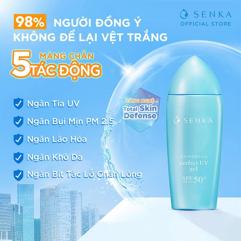 Gel Sữa Chống Nắng Dưỡng Ẩm Senka Perfect UV Gel SPF 50+/PA++++ là kem chống nắng thuộc thương hiệu Senka với công nghệ màng lọc 5 tác động giúp cùng chỉ số chống nắng cao SPF 50+/PA++++ giúp bảo vệ da tối ưu trước các tác động từ tia UV. Đồng thời với các thành phần dưỡng ẩm hiệu quả giúp dưỡng ẩm da, làm dịu mát làn da, giúp da luôn ẩm mịn.
