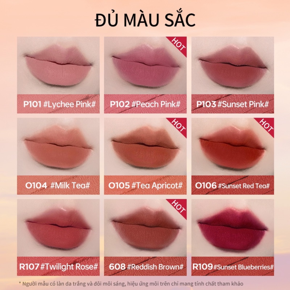 Kết cấu: Chất son dạng mousse, siêu mịn và lì, dễ tán lên môi và giữ màu cả ngày dài.