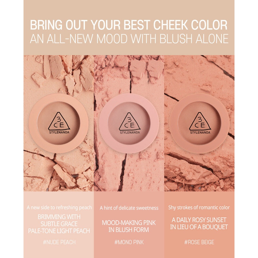- Là phấn má hồng dạng nén nằm trong dòng sản phẩm Mood Recipe của thương hiệu 3CE với thiết kế hộp phấn có gam màu nền nhã nhặn, và phần nắp phía trên trong suốt giúp bạn dễ dàng quan sát được màu sản phẩm bên trong