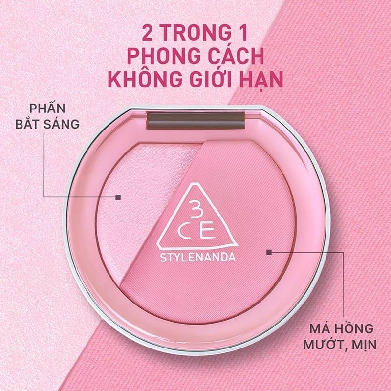 Phấn Má Hồng Bắt Sáng 3CE Blushlighter là má hồng thuộc thương hiệu 3CE. Sản phẩm là sự kết hợp hoàn hảo giữa má hồng và highlight trong cùng một sản phẩm, vừa tạo màu má hồng tự nhiên, vừa thêm độ sáng nhẹ, bắt sáng cho hiệu ứng rạng rỡ tự nhiên. Đồng thời chất phấn mịn nhẹ, dễ tán, bền màu cho đôi má hồng hào, tươi tắn nhiều giờ.