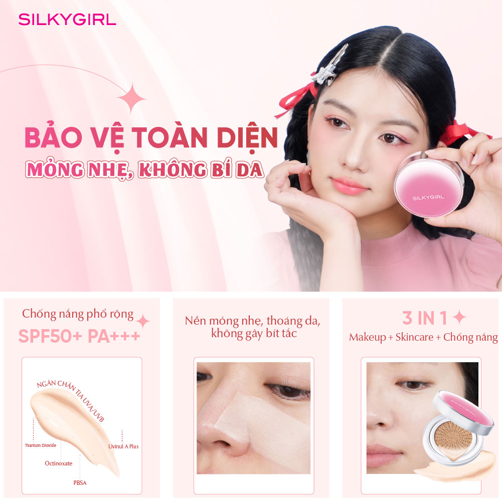 Phấn nước chống nắng lâu trôi SILKYGIRL Serum Cushion SPF50+PA+++ 13g là dòng phấn nước chống nắng lâu trôi đến từ thương hiệu Silkygirl của Malaysia cải tiến mới với công thức giàu dưỡng chất, mang đến lớp nền mịn lì tự nhiên nhưng vẫn giữ được độ căng bóng khỏe khoắn. Với chỉ số chống nắng cao SPF50+ PA+++ cùng công nghệ hiện đại, sản phẩm không chỉ giúp che phủ khuyết điểm mà còn nuôi dưỡng làn da rạng rỡ, tươi trẻ cả ngày.