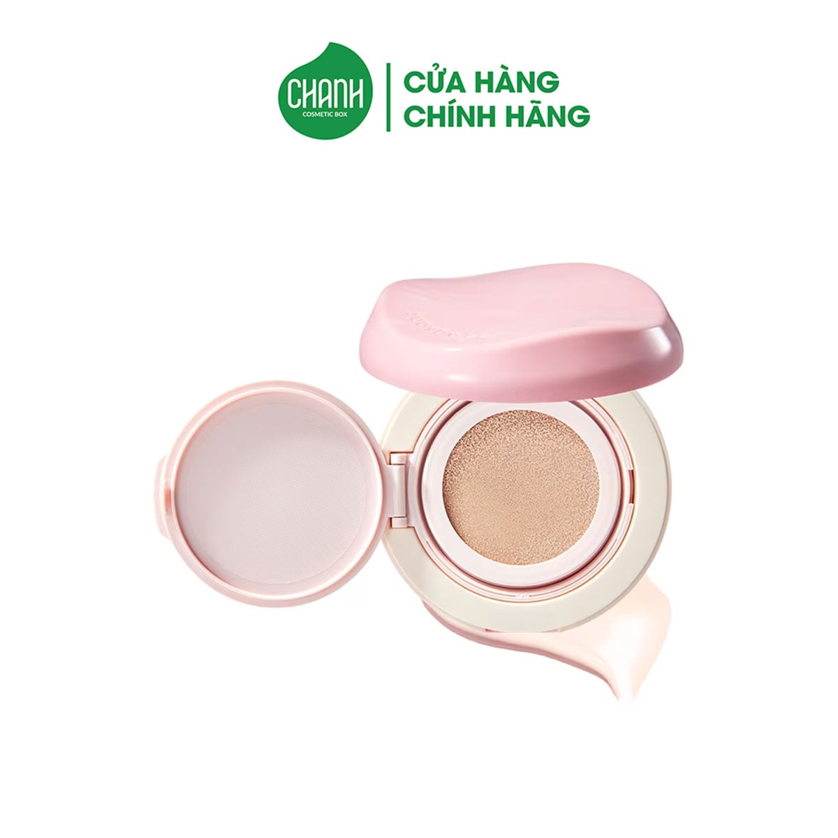 - Apply cushion lên da. Lưu ý thao tác dặm, không quẹt, miết. Thao tác từ những khu vực phẳng lớn như má, trán, sau đó gập đôi bông mút để dặm nền vào các khu vực nhỏ như dưới mắt, khóe mũi.