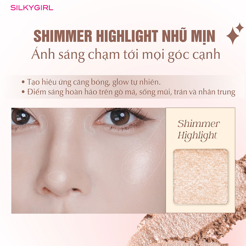 3. TẠO HIỆU ỨNG BÓNG KHỎE (c – Shimmer Highlight): Nhấn sáng vùng gò má, đầu mũi, nhân trung cho hiệu ứng căng bóng tự nhiên.