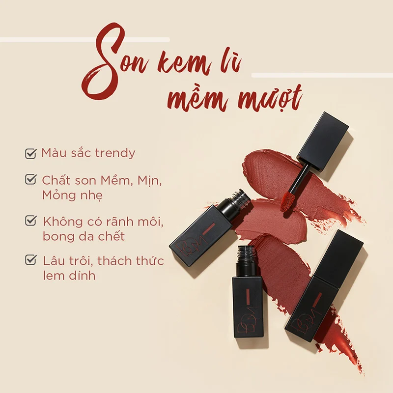 - Công thức son lì không bết dính, lên môi nhẹ tênh, chất son mỏng tinh tế.