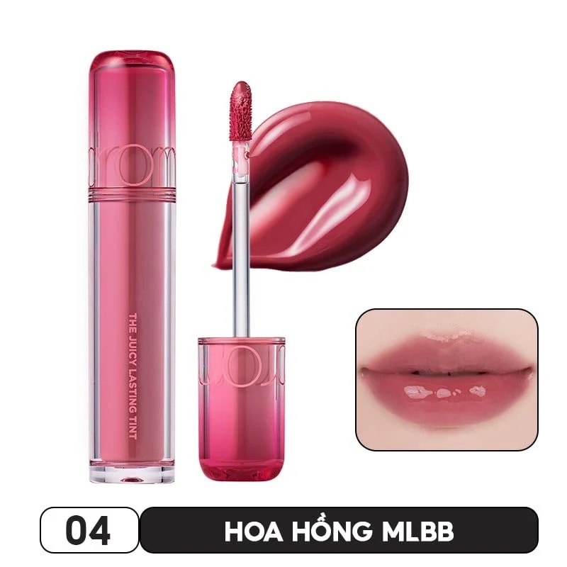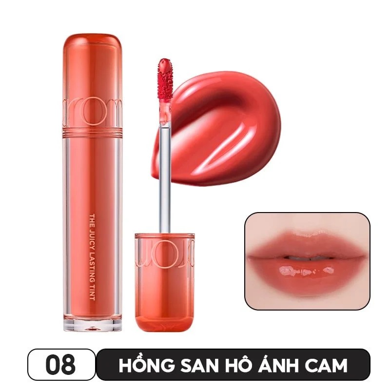 Son Tint Lì, Căng Bóng Romand The Juicy Lasting Tint: Có thiết kế mới lạ với hình dáng thân trụ tròn có 2 lớp thiết kế như lớp ngoài trong suốt thể hiện độ bóng của son, lớp bên trong là màu son thực tế giúp người dùng dễ dàng nhận diện màu son. Sự kết hợp hài hòa vỏ trong suốt và lớp màu son tạo nên hiệu ứng lung linh, giống như ánh sáng phản chiếu từ độ bóng của son trên môi. Độ bóng dày như được nhân đôi lớp bóng, che phủ nếp nhăn cho đôi môi mượt mịn, mang đến môi trong trẻo, căng bóng.