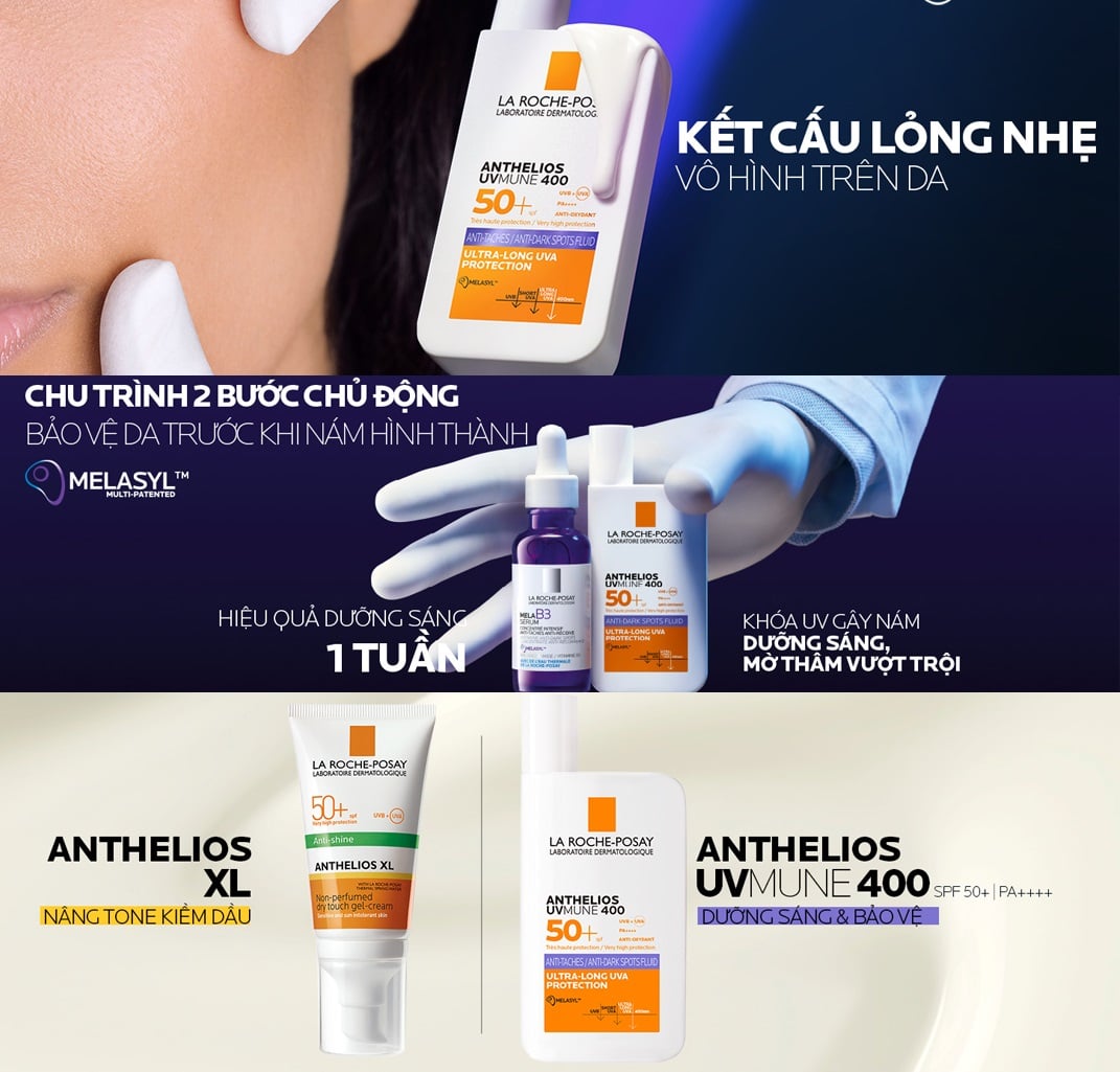 Sữa Chống Nắng La Roche-Posay Dưỡng Sáng Mờ Thâm SPF50+ 50ml là sản phẩm chống nắng da mặt đến từ thương hiệu La Roche - Posay của Pháp. La Roche-Posay Anthelios UVMune400 Anti-dark Spots chứa hoạt chất dưỡng sáng Melasyl kết hợp cùng màng lọc phổ rộng Mexoryl 400 giúp khóa UVA gây nám từ bên ngoài, đồng thời ngăn chặn đốm nâu hình thành từ bên trong. Sữa Chống Nắng La Roche-Posay giúp bảo vệ da phổ rộng, hỗ trợ ngăn ngừa thâm nám, tăng cường dưỡng sáng da và cải thiện sắc tố da. Kết cấu sữa chống nắng lỏng nhẹ, vô hình trên da