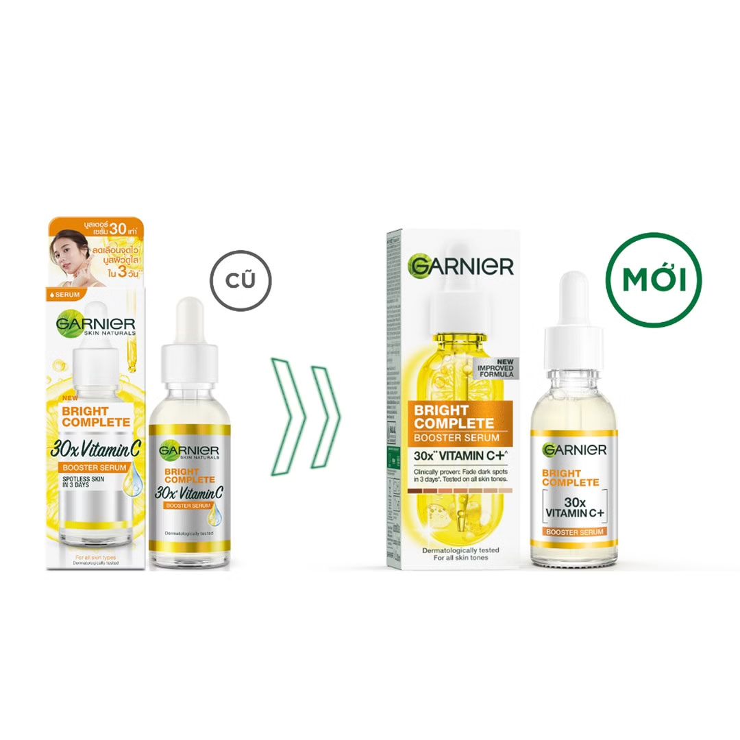 Tinh chất tăng cường sáng da mờ thâm Garnier Bright Complet 30x Vitamin C Booster Serum với công thức nồng độ Vitamin C đậm đặc gấp 30 lần từ Vitamin C và tinh chất quả Yuzu. Làn da sáng và mờ thâm (thâm mụn) từ sau 3 ngày sử dụng.