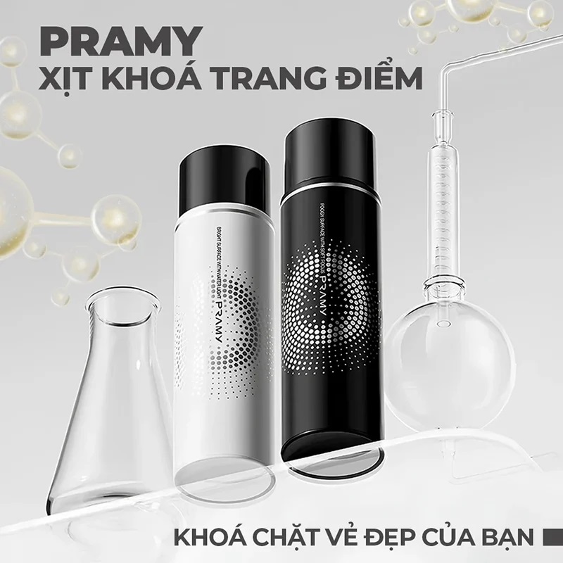 Xịt Khóa Nền Cố Định Trang Điểm Pramy Setting Spray Finish là xịt khoá nền của thương hiệu Pramy. Công nghệ khóa makeup độc quyền giúp tạo lớp màng bảo vệ, hạn chế tình trạng lem và trượt nền, mốc nền. Tia sương mịn nhỏ được tính bằng mi-crô-mét, nhờ đầu bơm vi áp và xịt rộng 90 độ giúp tia xịt vừa mịn vừa trải đều khắp mặt, che phủ toàn bộ gương mặt.