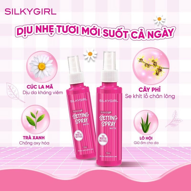 Xịt Khoáng Silkygirl Cố Định Lớp Trang Điểm, Cấp Ẩm, Kiềm Dầu, Bảo vệ Da là xịt cố định makeup đến từ thương hiệu Silkygirl với thiết kế dạng xịt phun sương mỏng nhẹ, tạo nên một lớp "lá chắn" trên da giúp cố định lớp trang điểm được bền màu lâu, tăng độ bám giúp không bị lem hoặc nhòe đi do đeo khẩu trang thường xuyên, đồng thời giúp cấp ẩm hiệu quả và bảo vệ da trước sự thay đổi của nhiệt độ môi trường ngoài, cố định lớp trang điểm thêm bền màu, lâu trôi suốt cả ngày dài.