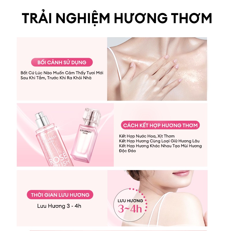 Colorkey Rose Crush Shimmer Fragrance Mist mang đến một sự kết hợp tinh tế giữa các tầng hương, tạo nên một trải nghiệm độc đáo: