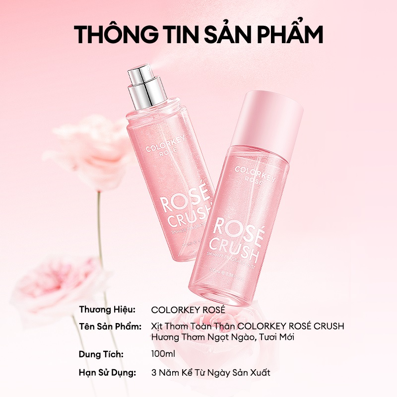 Colorkey Rose Crush Shimmer Fragrance Mist được chiết xuất từ các thành phần thiên nhiên như hoa hồng tươi, giúp mang đến hương thơm ngọt ngào và dịu nhẹ. Đặc biệt, sản phẩm còn chứa các dưỡng chất dưỡng ẩm như glycerin và panthenol, giúp cấp ẩm cho da một cách nhanh chóng và hiệu quả. Các thành phần nhũ nhẹ giúp tạo hiệu ứng lấp lánh trên da mà không gây bết dính hay khó chịu.
